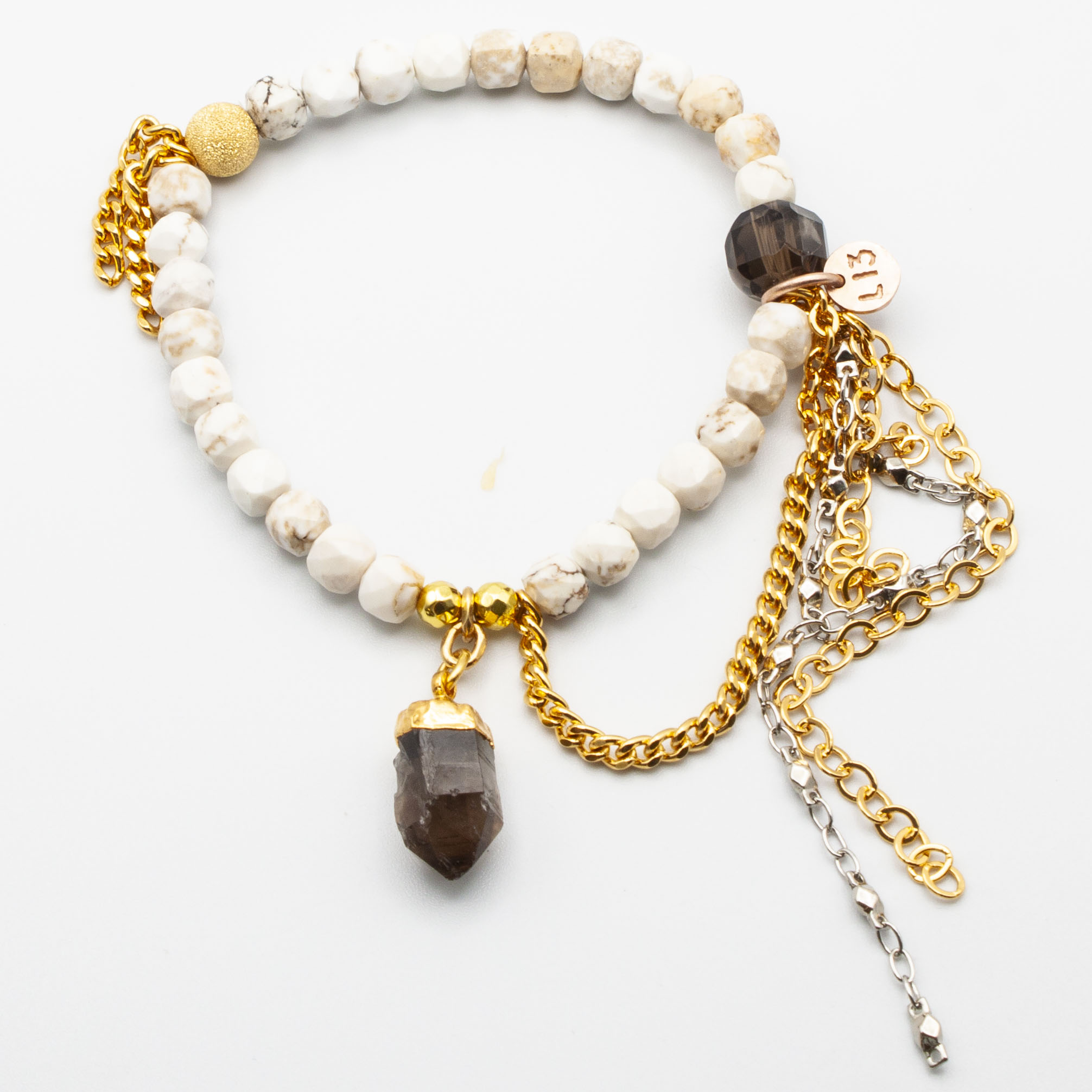 White turquoise with a 18kt gold plate wrapped smoky quartz crystal pendant. 18kt gold stardust accent bead and gold rhodium chain and tasseling. 6mm 7 inch stretch bracelet.