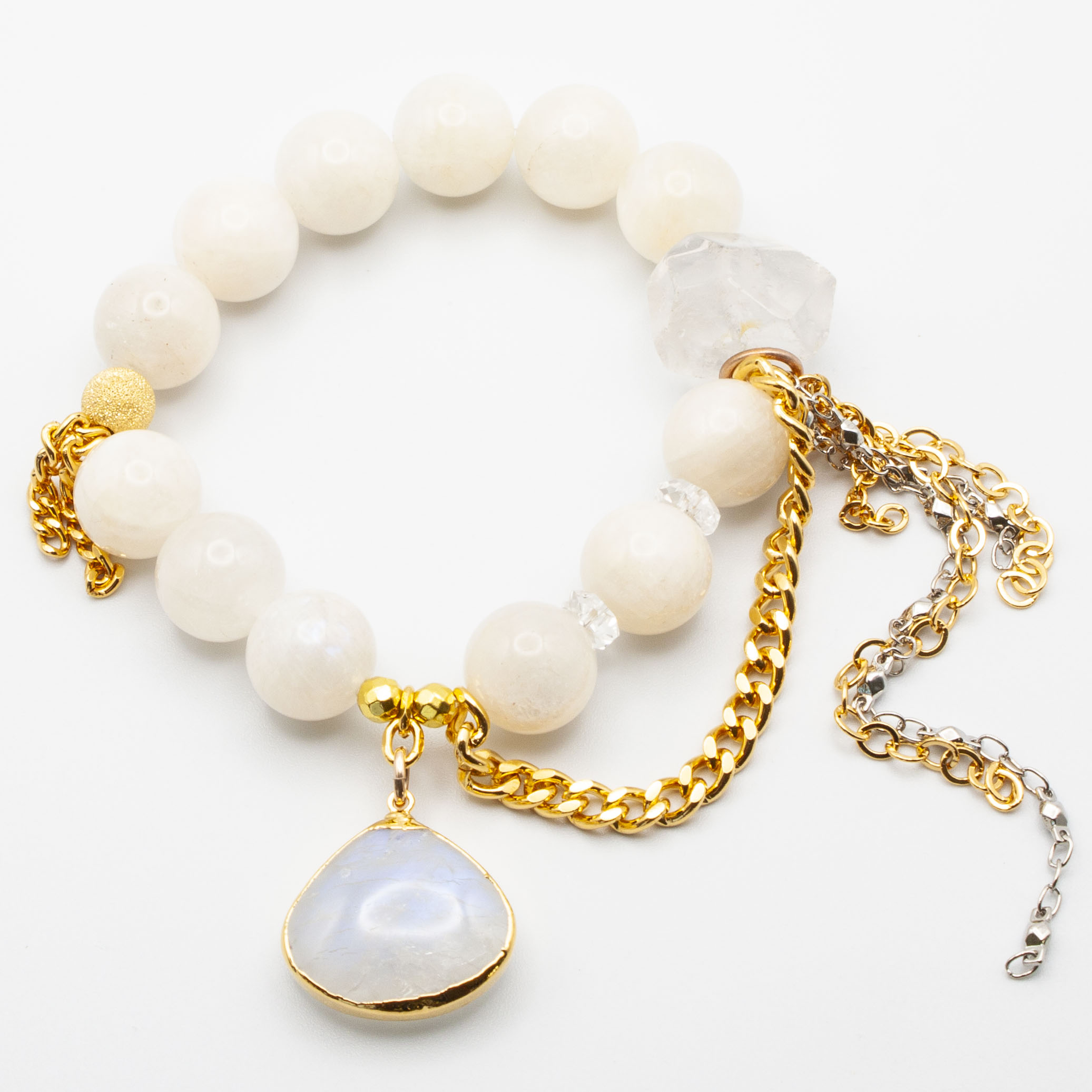 Winter white moonstone with a 18kt gold plate wrapped moonstone pendant. 18kt stardust accent bead and gold rhodium chain and tasseling. Quartz crystal accents. 12mm 7 inch stretch bracelet.