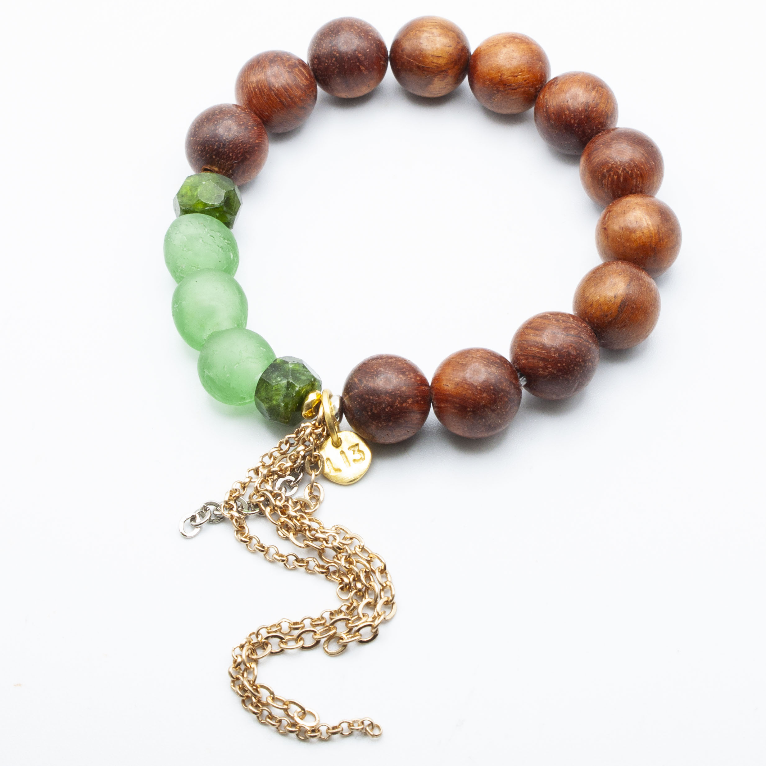 Wood beads with glass and diopside accents. 10mm 7″ stretch bracelet.