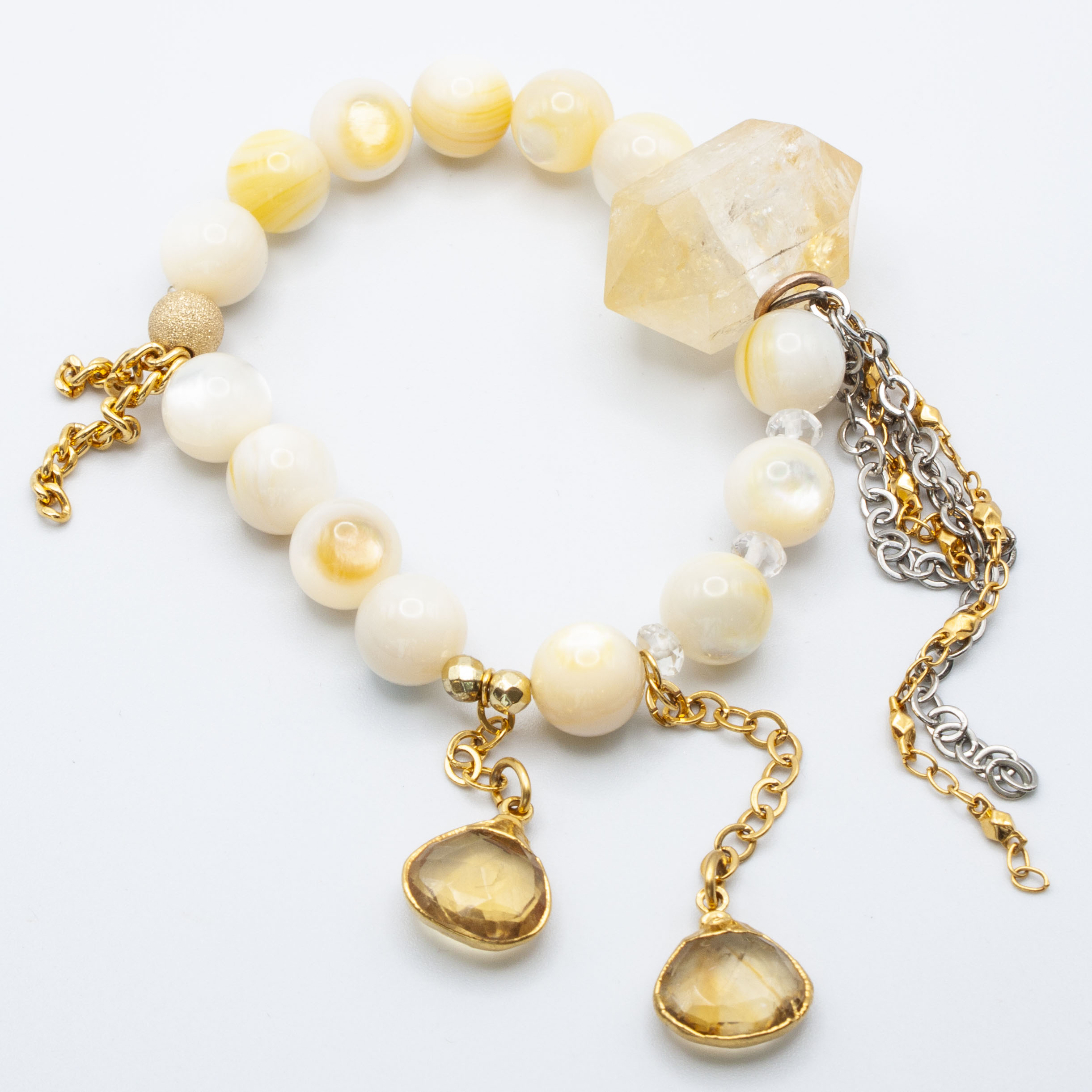 Yellow abalone with 18kt gold plate wrapped citrine pendants. 18kt gold stardust accent bead and gold rhodium chain and tasseling. 10mm 7 inch stretch bracelet.